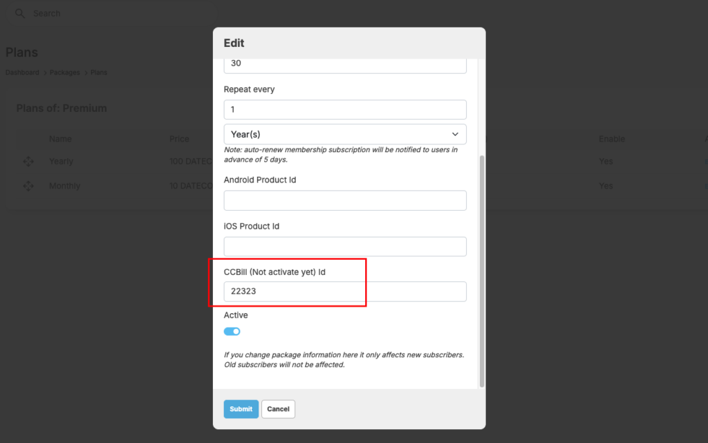After the CCBill gateway is properly configured, you need to create a subscription plan to obtain the CCBill Plan ID. Then, enter the CCBill Plan ID into the corresponding subscription plan on your site.