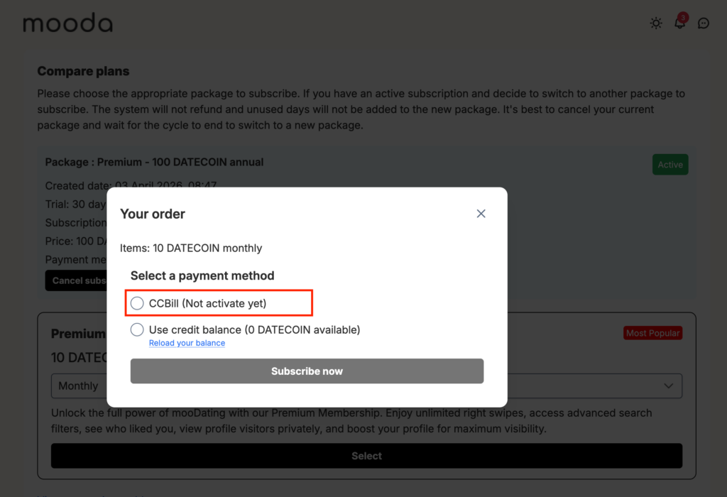 mooDating supports CCBill, a trusted payment gateway widely used in the dating industry. Unlike many popular providers such as Stripe or PayPal—which often have restrictions for dating platforms—CCBill is designed to support subscription-based and high-risk businesses, making it an ideal choice for your site.