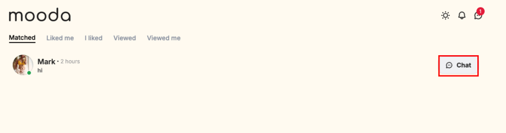 The Matches section is where users can manage their connections and track profile interactions in one convenient place. It displays a list of profiles where both users have liked each other, creating a match. For each match, users can quickly view the latest message and jump directly into conversation using the chat button.