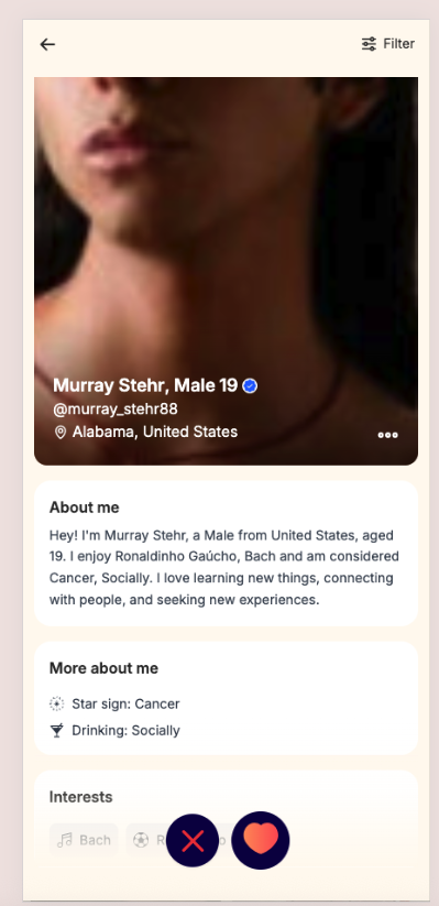 The Swipe page includes the same powerful filtering options as the Explore section, allowing users to narrow results by gender, age range, and detailed profile attributes. Any changes made to filters are automatically synced between Swipe and Explore, ensuring a consistent discovery experience.